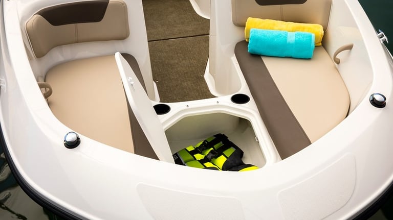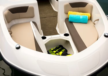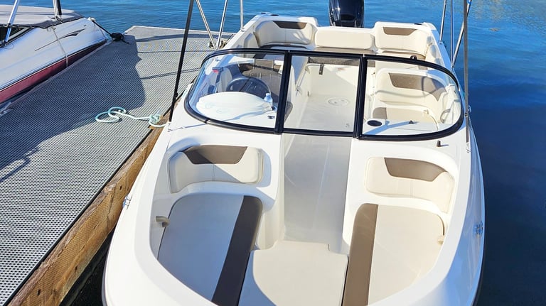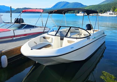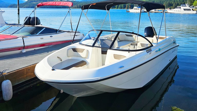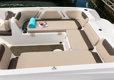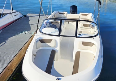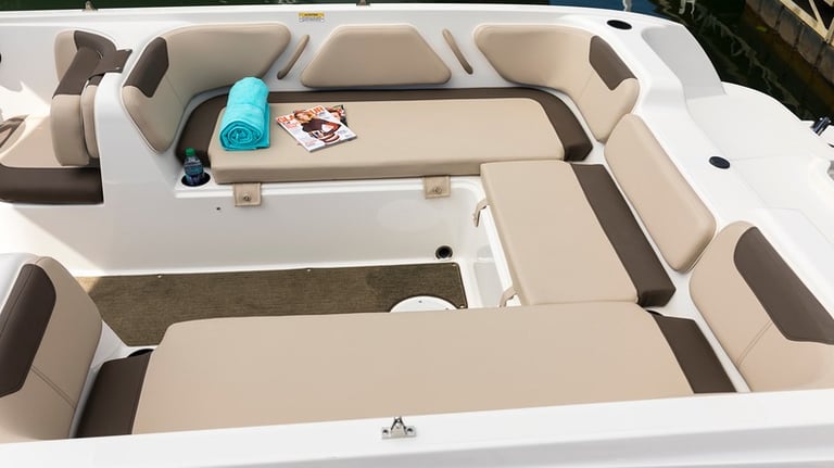 The perfect power boat for family trips out on the water, fully cushioned, swim platform and swim ladder, with bimini top sun shade.